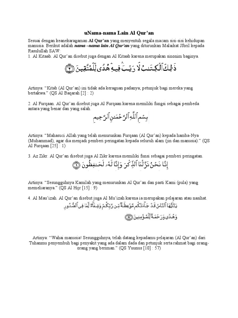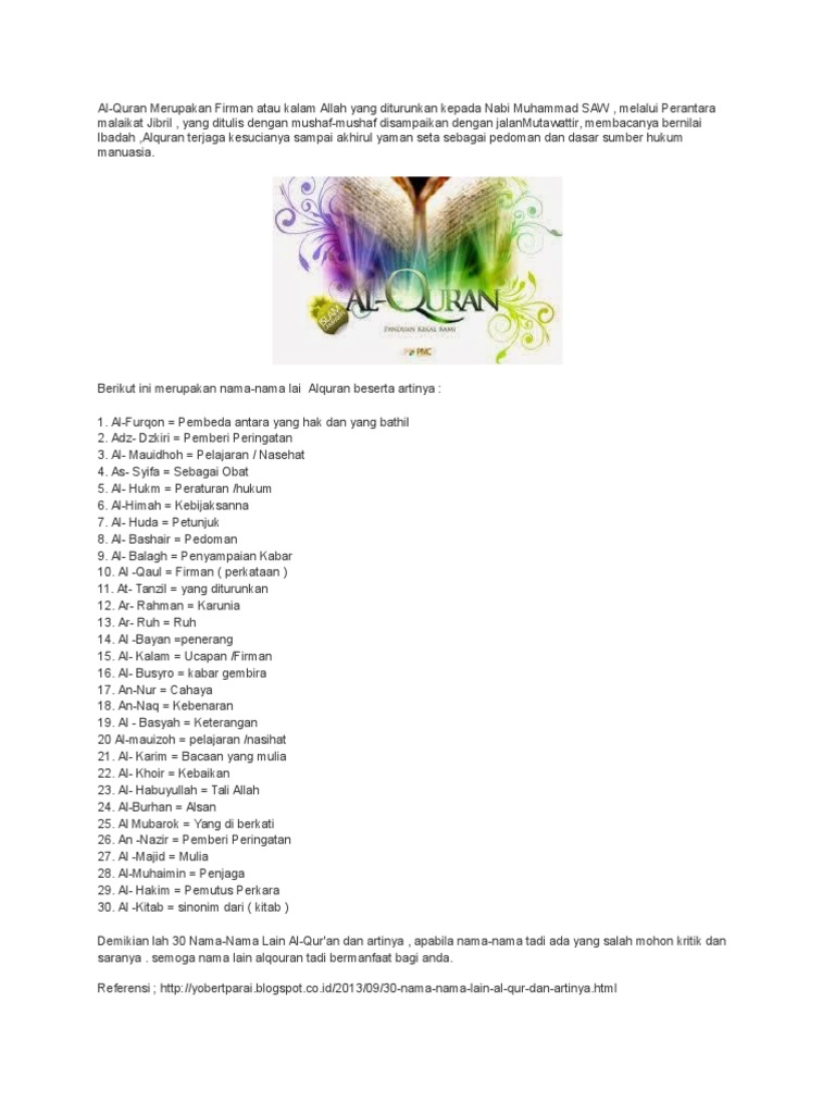 Nama Lain Al Quran / Dan sebagian yang lain mempunyai lebih dari satu nama.. Al qur'an secara bahasa memiliki arti bacaan. Hal ini karena setiap surat dan ayat yang terkandung di dalam kitab. Nama lain hari kiamat | hari kiamat adalah hari dimana hancur leburnya seluruh alam semesta yang berarti matinya seluruh mahluk hidup kecuali yang allah subhana hu wataala kehendaki, hal ini sesuai dengan surat al zalzalah ayat 1 dan surat az zumar ayat 68. 0 ratings0% found this document useful (0 votes). Dan sebagian yang lain mempunyai lebih dari satu nama.
