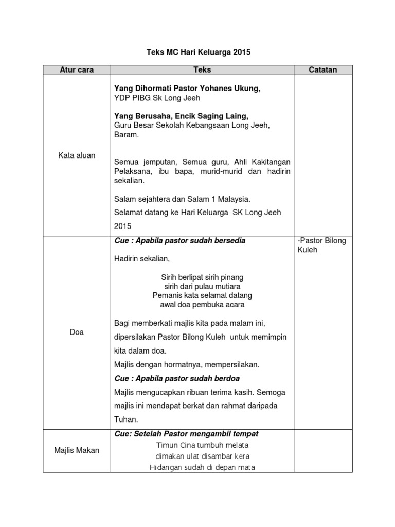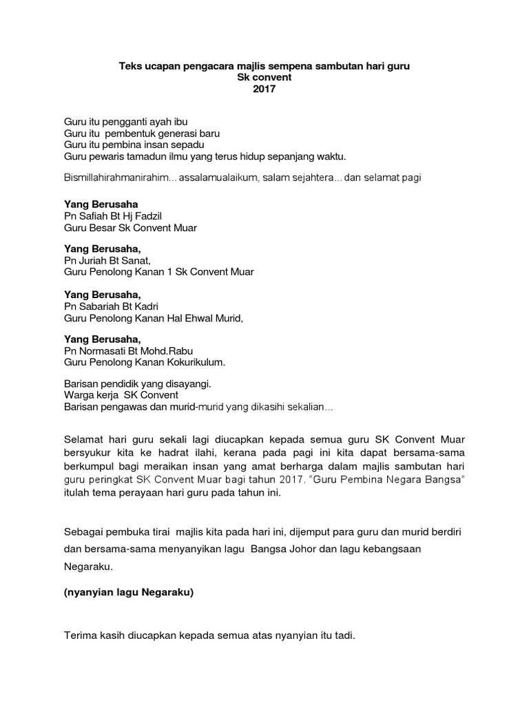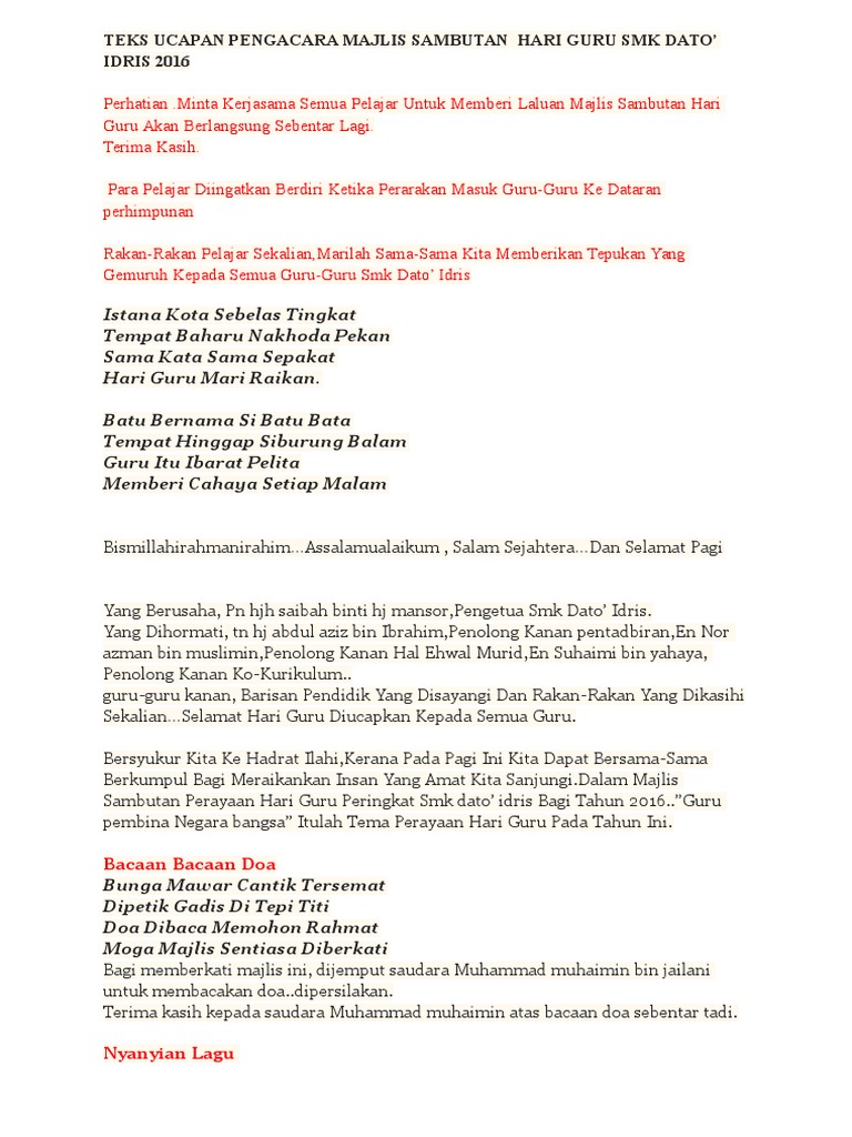 Dengan adanya contoh teks mc, maka yang bersangkutan menjadi lebih dimudahkan karena adanya masukan mengenai susunan acara dibawah ini adalah contoh naskah pembaca acara formal yang dapat anda sesuaikan dengan keperluan anda. Guru besar untuk menambahkan keserian majlis, ucapan guru besar kita dengarkan. السلام عليكم ورحمة الله وبركاته. Dalam rangka memperingati hari guru nasional sebagai bentuk penghormatan, penghargaan dan apresiasi terhadap guru yang dianggap sebagai pahlawan tanpa tanda jasa. Menarik perhatian ibubapa, murid dan orang ramai kepada peranan penting kaum guru dalam masyarakat.