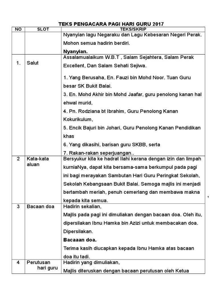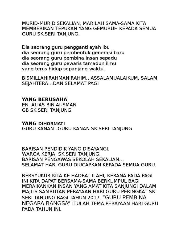 Hari guru nasional pertama kali ditetapkan oleh pemerintah republik indonesia melalui keputusan presiden no 78 tahun. Hari ini tepatnya di tanggal 2 mei seluruh bangsa indonesia tentu saja memperingati hari. Dengan adanya contoh teks mc, maka yang bersangkutan menjadi lebih dimudahkan karena adanya masukan mengenai susunan acara dibawah ini adalah contoh naskah pembaca acara formal yang dapat anda sesuaikan dengan keperluan anda. Semoaga bapak dan ibu guru selalu diberikan semangat dalam menjalankan tugasnya untuk medidik. Untuk membuatnya lebih mudah bagi anda. Teks mc formal acara peringatan hari nasional. Berikut ini ulasan teks lengkap pidato mendikbud untuk hari guru. 100%(1)100% found this document useful (1 vote). Contoh teks mc acara seminar anti narkoba. Guru itu pembentuk generasi baru guru itu pembina insan sepadu guru pewaris tamadun ilmu yang terus hidup. Teks pengacara penting untuk memastikan program berjalan dengan lancar. Cari teks mc khotmil qur'an, teks mc khatam qur'an dan teks mc khatam alquran? Alhamdulillah, telahpun dapat kita kongsikan untuk kegunaan di semua sekolah seluruh malaysia.